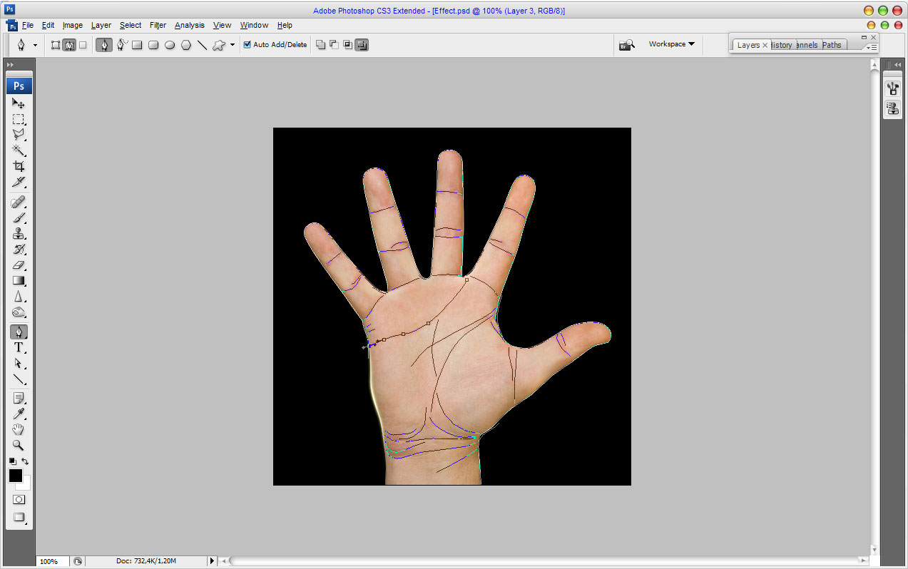 Create a new line using the Pen Tool on the same way. Our task is to create the largest possible number of visible lines to make the silhouette clearer. In order not to create each line individually, and not spend too much time you can pressCtrl when finished to create a line, and click on the canvas. After that, you can create a new line regardless of the place where the previous line ended.